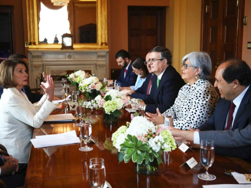 El secretario de Relaciones Exteriores, Marcelo Ebrard y la secretaria de Economía, Graciela Márquez, se reunieron esta tarde en Washington con Nancy Pelosi, la líder demócrata en el Congreso, con quien dialogaron sobre el proceso de ratificación del T-MEC (USMCA) en México y Estados Unidos y la postura de nuestro país respecto a la decisión del presidente Donald Trump de imponer aranceles a los productos mexicanos a partir del 10 de junio.